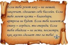 "Жизнь может поворачиваться к вам лицом, может другим местом, но мало кто понимает, что вы сами её и поворачиваете. Все дурные мысли в сторону других оборачиваются вам. Все зависти тоже идут, в конце концов, к вам. А зачем это надо? Живите спокойно и размерено… Завидовать нельзя, да и незачем.. Ну есть у того человека большая машина, но рожа то у него от этой машины лучше не станет… Золото вообще грязный металл, ему нечего завидовать. Чаще улыбайтесь и вам тоже улыбнутся прохожие, близкие и даже сама жизнь." (Карагай)